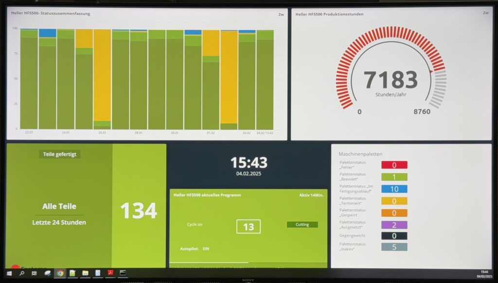 Das Dashboard der MMS: Produktivität und Auslastung auf einen Blick. Das Unternehmen hat demnach in zwei Wochen 7.183 Stunden des Jahres im Automatisierungsmodus gefertigt. (Bild: Cutmetall Recycling Tools Germany GmbH)