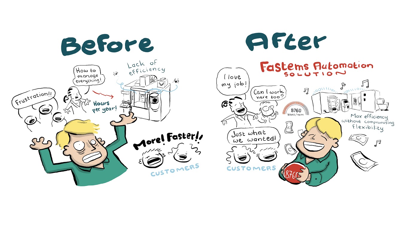 Diese Geschichte beruht auf einer Reihe von Fällen, die unsere Partner und auch wir tatsächlich erlebt haben. Automation ist erstaunlich einfach und kann Ihnen vielfältige Potenziale für höhere Renditen bieten, wenn Sie ihr nur eine Chance geben. Die einfachste Lösung von Fastems ist beispielsweise eine Kombination aus MMS, flexiblem Palettencontainer (FPC) und Bearbeitungszentrum mit Palettenwechsler. Es kann so einfach sein! Vorausgesetzt, Sie sind bereit, einmal den gesamten Fertigungsprozess und die künftigen Anforderungen zu überdenken.